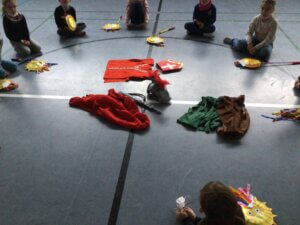 Am 11.11. zogen wir mit unseren selbst gebastelten Laternen in die dunkle Turnhalle. Im Kreis lagen ein geteilter roter Mantel, ein Schwert, ein Soldatenhelm, zerrissene Kleidung und ein Bischofsgewand.