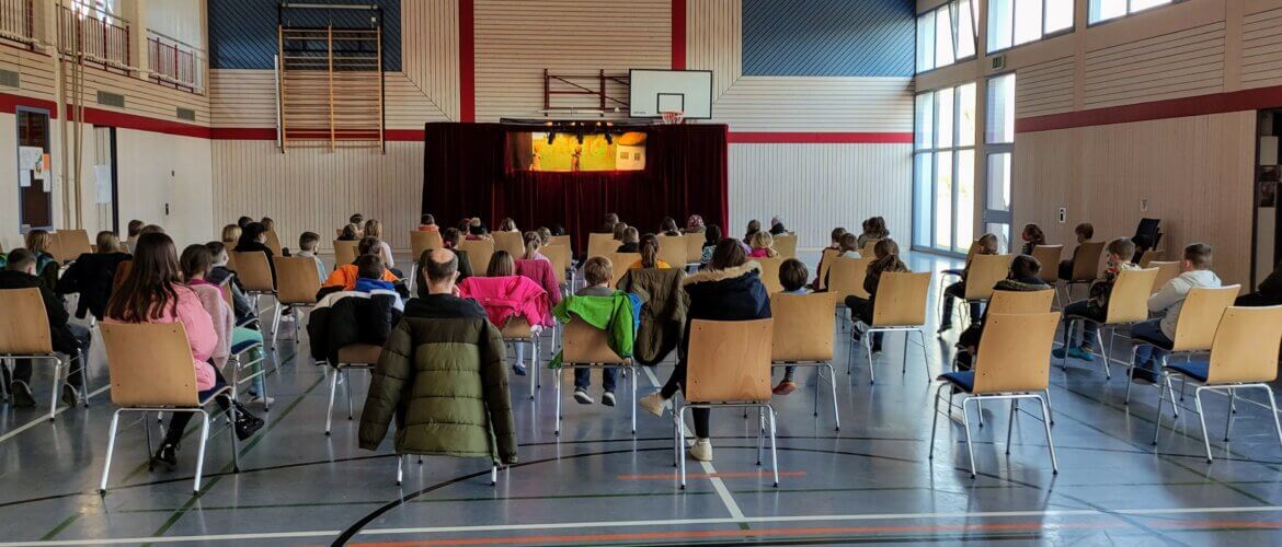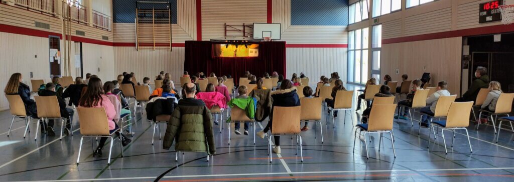 Die Kinder der ersten und zweiten Klassen saßen ganz gespannt auf ihren Stühlen und verfolgten sehr aufmerksam das Stück. Die Schnecke Meme, die zu Beginn, zwischen den Akten und am Ende auftauchte, wusste auch, wie man die Kleinen an unserer Schule zum Lachen bekommt. Es war eine sehr schöne Abwechslung. Vielen Dank an das Team und auch an die Hausmeister, die die Halle so gut vorbereitet hatten.