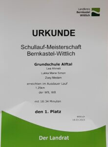 Nach drei Jahren gab es endlich wieder Schullaufmeisterschaften für die Grundschulen im Kreis Bernkastel-Wittlich. Mit 20 Teilnehmern stellte die Grundschule Alftal eines der größten und erfolgreichsten Teams. Die 8 und 9 Jahre alten Mädchen gewannen die Mannschaftswertung vor den Grundschulen Kröv und Piesport. Lea Ahmeti aus der Klasse 3b wurde bei den 9-Jährigen Vizemeisterin. Viertschnellste bei den 8-jährigen Mädchen war Lukka Marie Simon aus der Klasse 2a. Den dritten Platz verpasste sie nur um eine Sekunde. Auch Zoey Medam aus der Klasse 3b schaffte es bei den 9-Jährigen als Fünfte unter die besten Zehn. Im Lauf der 8- und 9-jährigen Jungen wurde Max Patejdl aus der Klasse 2b Vierter. Alle Kinder bis 9 Jahre liefen 2 Runden (1250m) im Wittlicher Stadtpark, alle älteren 3 Runden (1875m). Josephina Scheid aus der Klasse 4a schaffte es bei den 10-Jährigen auf den 4. Platz.