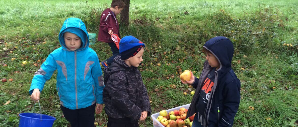 An einem verregneten Freitag ging es zum „Äppel raffen“ auf die Gemeindewiese. Hier galt es, genügend Äpfel zu sammeln, die Hausmeister Dieter Adams im Anhänger zur Schule transportierte.