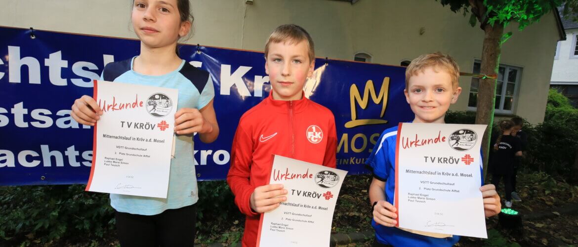 Wie bereits 2023 nahmen wieder Schülerinnen und Schüler der Grundschule Alftal am Kröver Mitternachtslauf teil. Trotz kurzfristiger Planung waren 17 junge Läufer unserer Schule dabei. Damit waren wir das drittgrößte Grundschulteam aus der Verbandsgemeinde Traben-Trarbach. Mehr Teilnehmer hatten nur die Grundschule Kröv (38) und die Grundschule Traben-Trarbach (20).