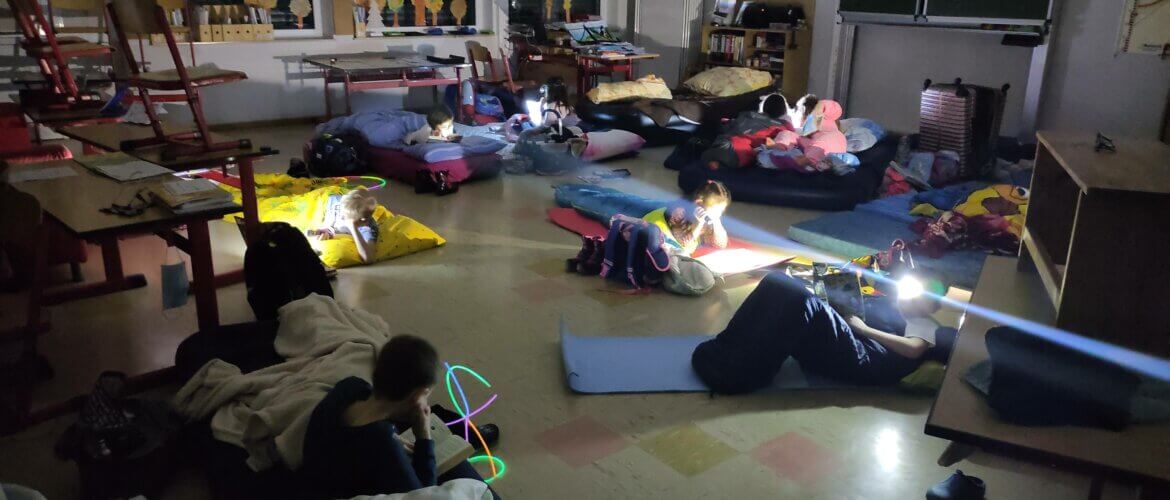 Gegen 23 Uhr gingen plötzlich die Rauchmelder im Neubau los und leider auch nicht mehr aus (Fehlalarm), weshalb wir mit Sack und Pack in unseren Klassenraum gezogen sind. Dort haben die Kinder noch in ihren Betten gelesen. Die ersten Kinder sind ziemlich schnell eingeschlafen, die letzten schalteten gegen Mitternacht ihre Taschenlampen aus.