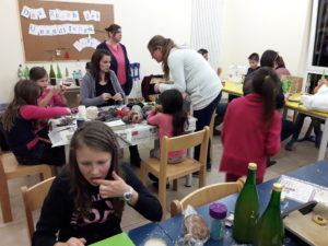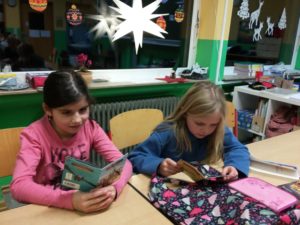 Die Kinder bedienten sich am reichhaltigen Angebot: Müsli-Bar, Vollkornbrote, verschiedene Tee- und Milchsorten, Orangensaft, Naturjoghurt, Obstsalat, Rohkost, Käse, ….