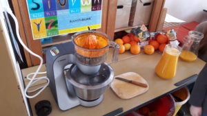 Äpfel, Bananen, Birnen, Trauben und Kiwis wurden für den Obstsalat geschnitten und frische Orangen zu Saft ausgepresst.