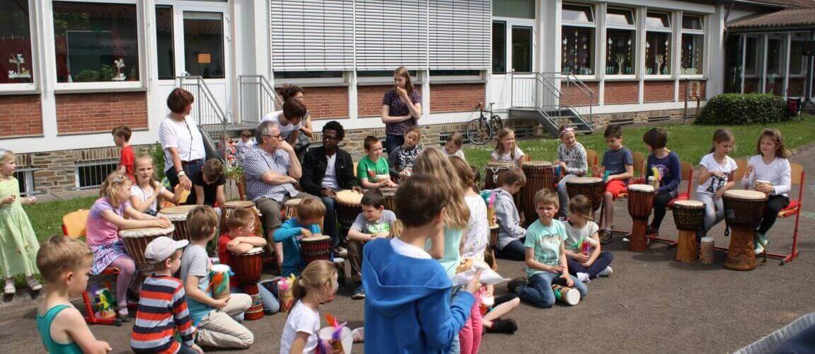 Die zweiten Klassen wählten das Thema Afrika. Zunächst lernten auch sie alles über das Schulleben und die Tierwelt Afrikas. Ein Highlight war für sie das Afrika-Mobil. So sahen sie mitgebrachte afrikanische Kleidung und Alltagsgegenstände. Gemeinsam studierten sie afrikanische Lieder ein und begleiteten diese mit selbst gebastelten Trommeln und Rasseln. Die Kinder bekamen einen Trommelworkshop. Zusätzlich bastelte jedes Kind seine eigene afrikanische Maske, sowie eine Lehmhütte und sie kochten afrikanisches Essen.