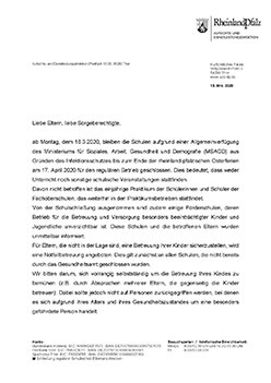 Laut Bildungsministerium bleiben alle rheinland-pfälzischen Schulen und Kitas ab Montag, 16.03.20 bis zum Ende der Osterferien am 17.04.20 für einen regulären Betrieb geschlossen.