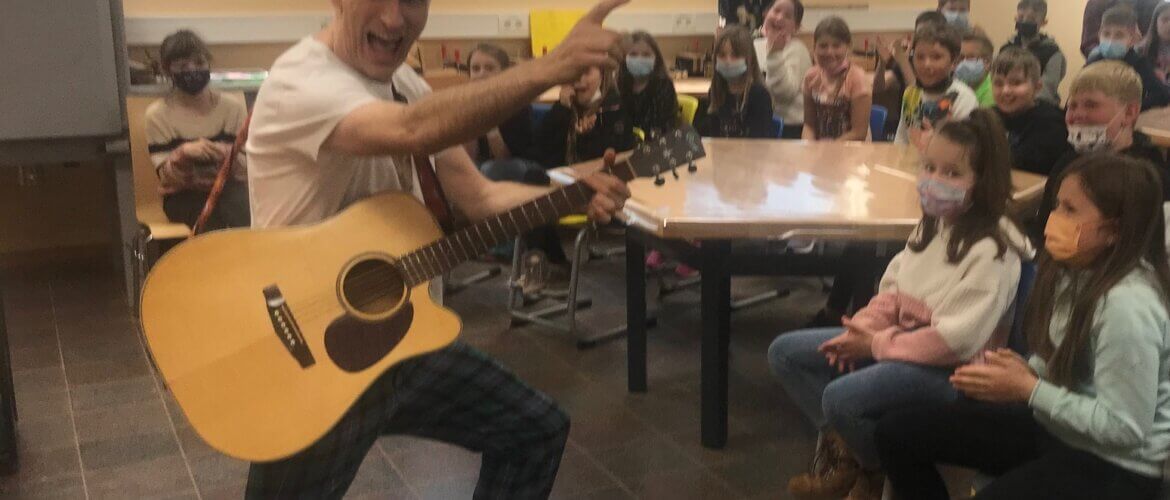 Für viele Kinder ist es immer wieder ein Höhepunkt, wenn sie einmal einen „echten“ Autoren treffen. Heute konnte auch den Kindern der 3. und 4. Klassen ein wenig Abwechslung im Schulalltag geboten werden, denn Thommi Baake trat mit seinem Programm bei uns in Kinderbeuern auf.